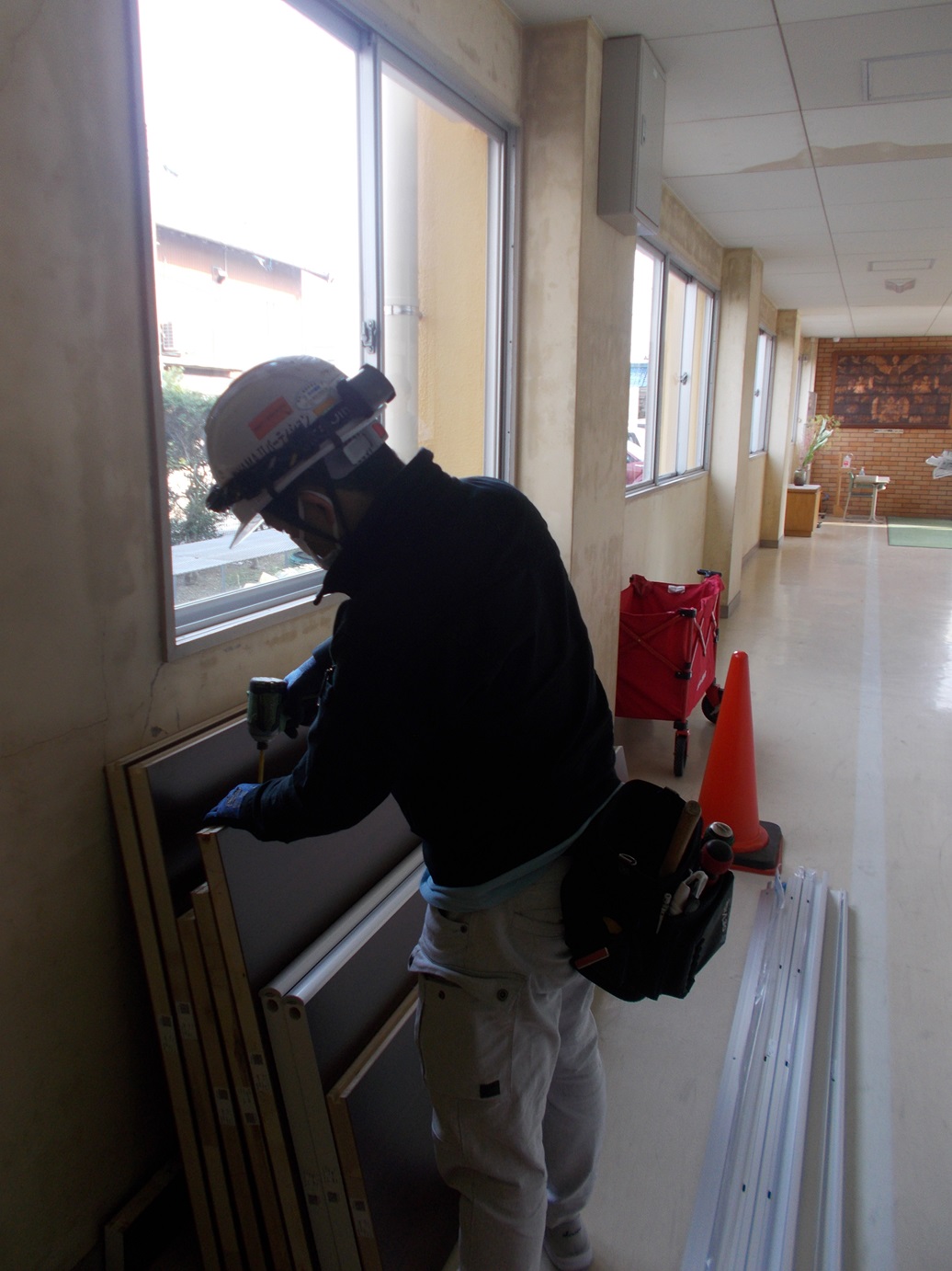 次の写真は、「トイレの改修工事」の様子です。工事中は、みなさんにご迷惑をかけていますが、工事の方々も、みなさんにきれいなトイレを使ってもらうために頑張っています!もう少しお待ちください!!