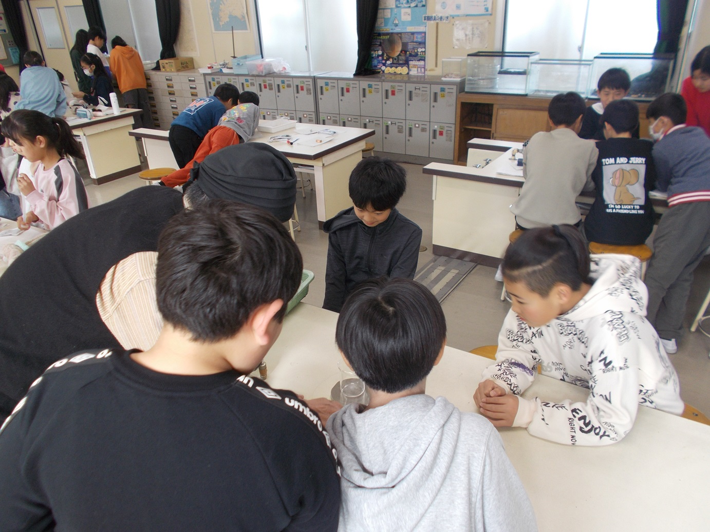 2組は、単元「もののとけ方」で、水100gに塩がどのくらいとけるのか、予想を生かしながら、学習を進めていました。