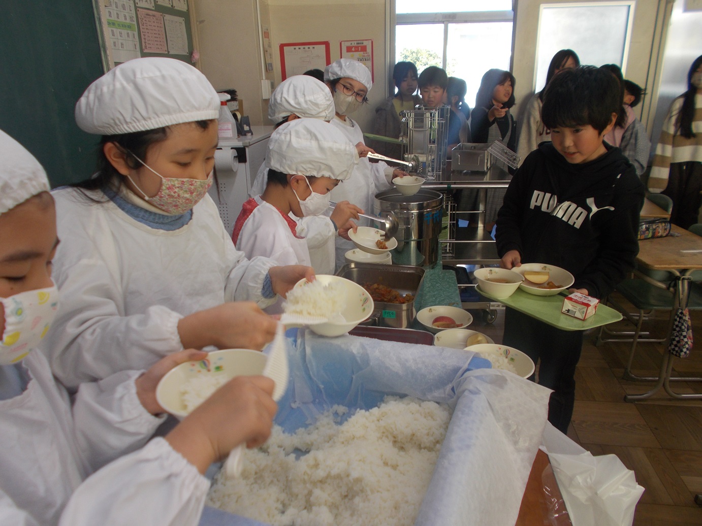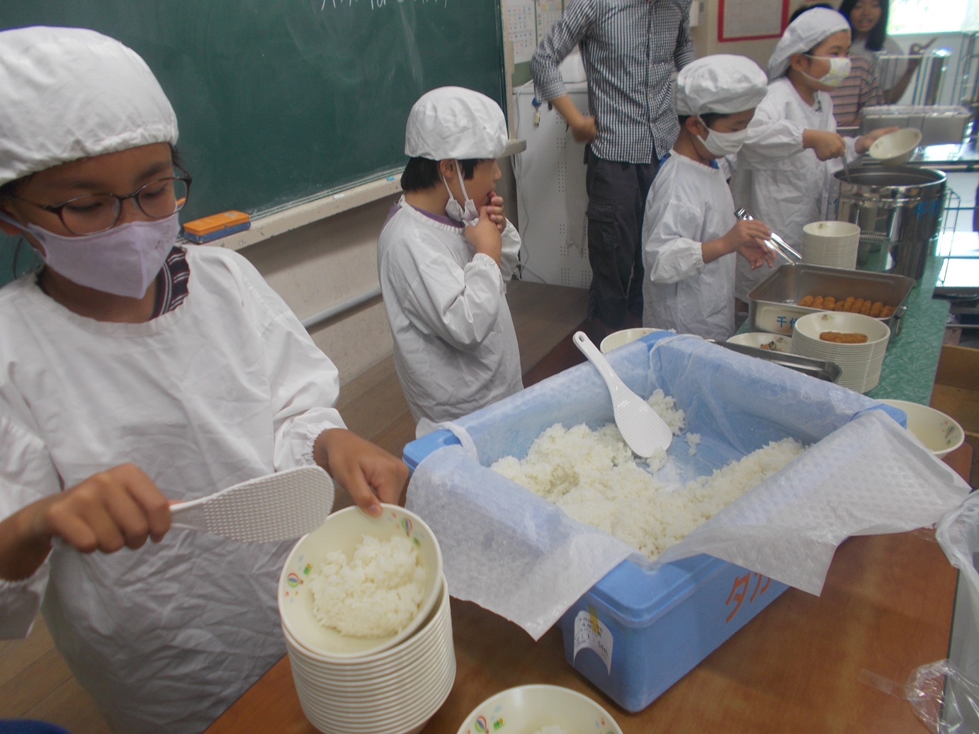 今日は、楽しい給食の時間の様子をお伝えします。自分たちで、分担して協力しながら準備を進めています。