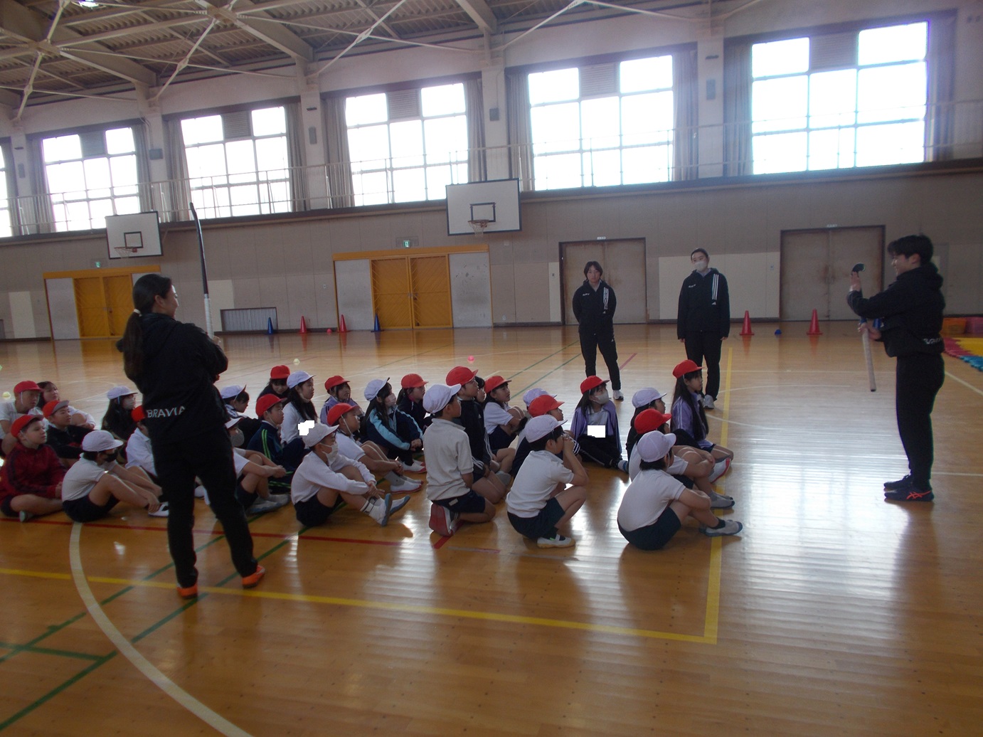 体育館でホッケー教室を行い、その後、教室で一緒に給食を食べました。自己紹介の中で、競技人生の目標や夢について語っていただき、