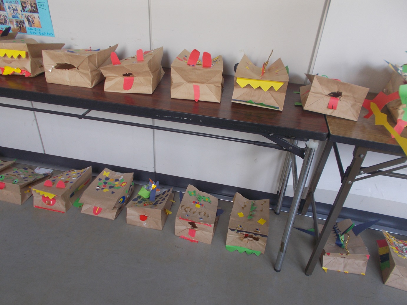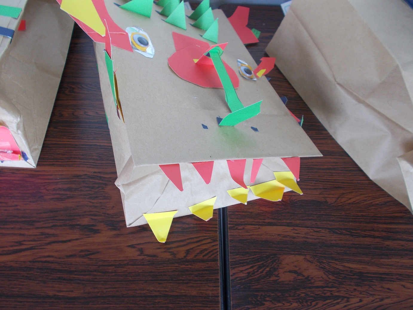 1年生の図画工作科の学習で、紙袋に色画用紙を切ったり貼ったりして「ぱくぱっくん」を作りました。