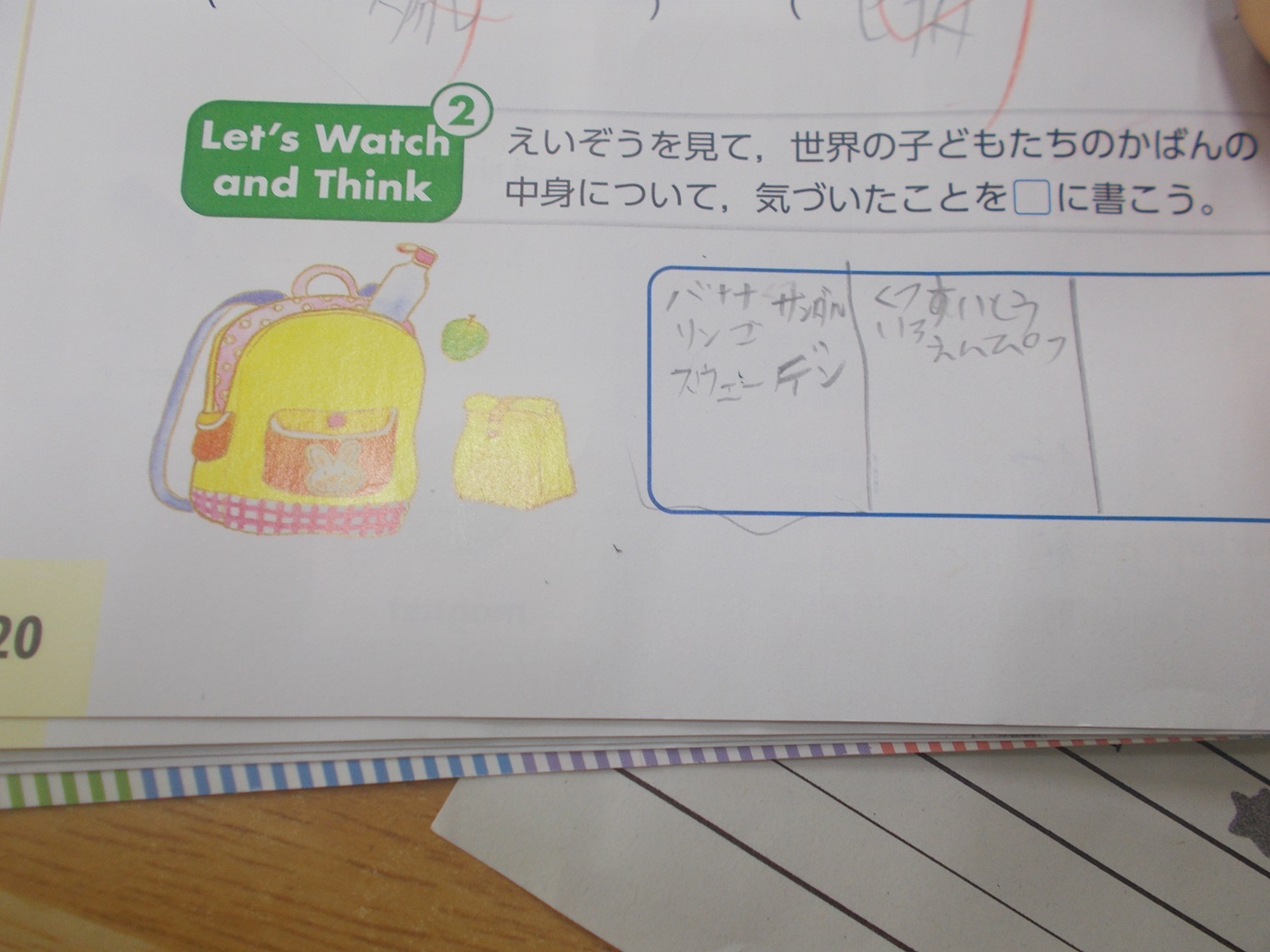 4年生の外国語活動です。現在は、学校で使う物(文房具)をたずねたり、答えたりする表現に慣れ親しむことをねらいに学習に取り組んでいます。