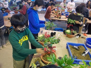 子どもたちは寄せ植えのポイントを教わり、自分の作品を熱心に作っていました。