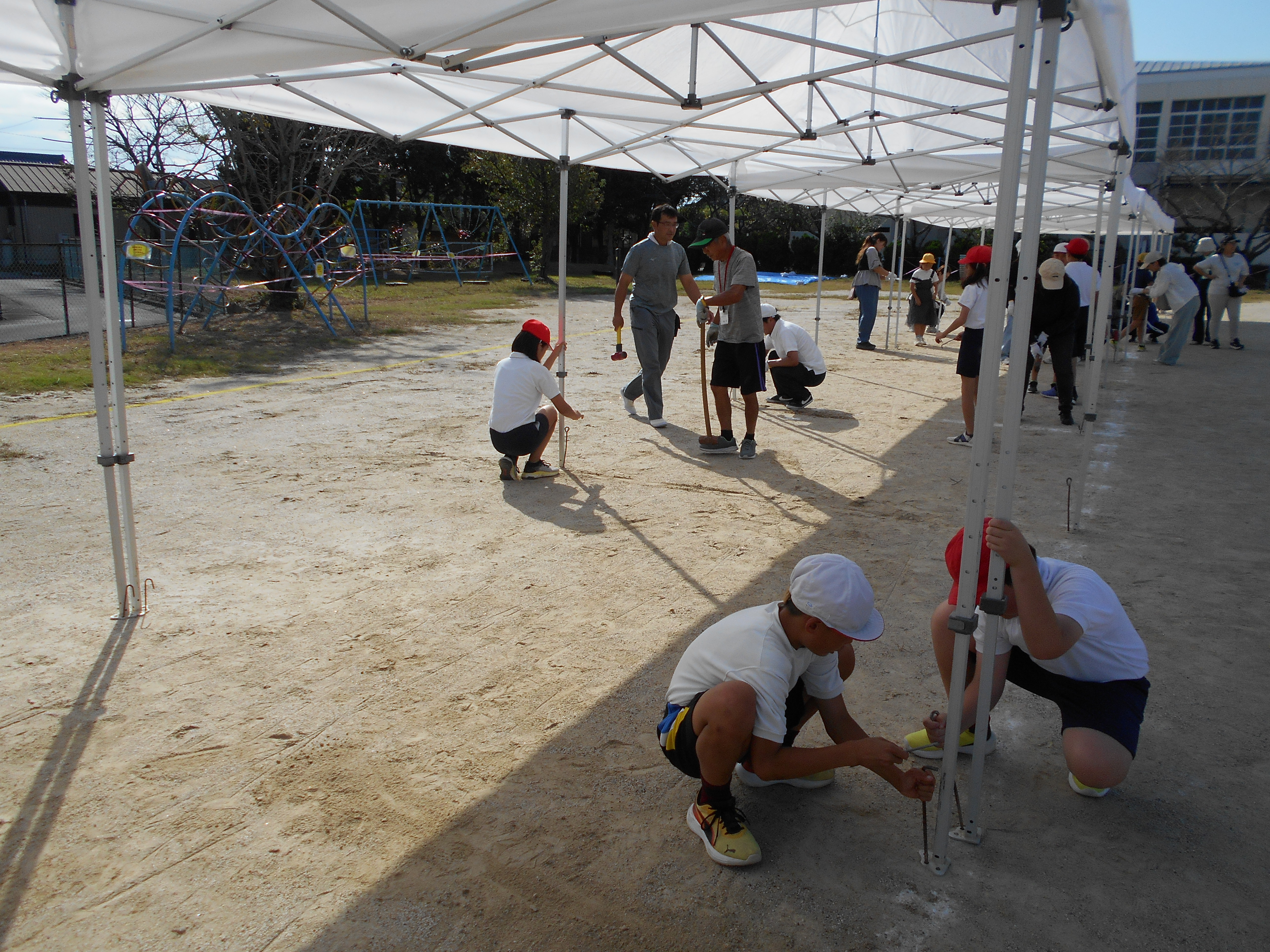 子どもたちは、PTAの皆さんがあっというまにテントを張り、力強くペグを打つ姿を、尊敬のまなざしでみつめていました。