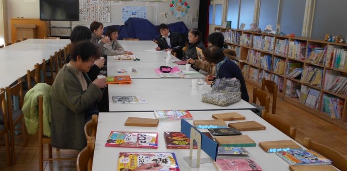 子どもたちは、次に読む本を借りるとすぐに「福笑い」で面白い顔を作って遊び始めました。
