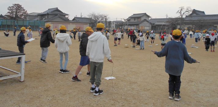 長縄跳びが得意な子も苦手な子も、休み時間になると運動場に集まって、自分の役割を担って練習に励んでいます。