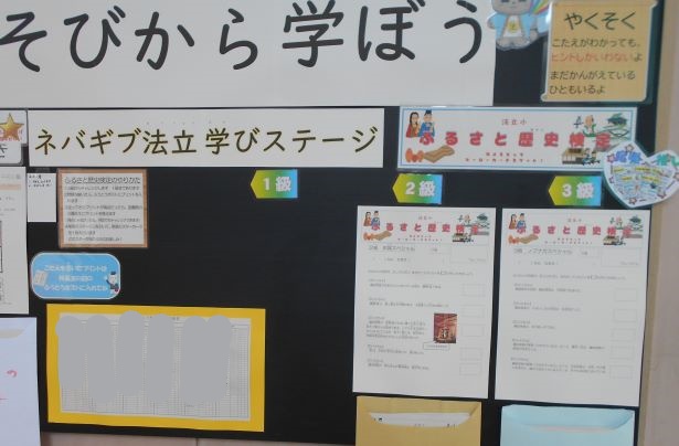 現在、校舎1階の掲示板は「なるほど できたよ 法立学び隊!」という学習コーナーになっていて、「迷路」「間違い探し」「謎解き」などが掲示されています。