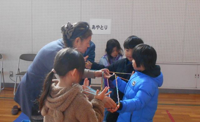 ねんりんクラブの皆さんに、けん玉、めんこ、羽根つき、お手玉、あやとり、コマ回しの遊び方を教えていただきました。
