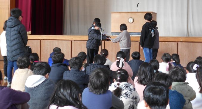 1時間目は、始めに始業式を行い、式後に6年生と3年生の代表児童が新年の抱負を発表しました。