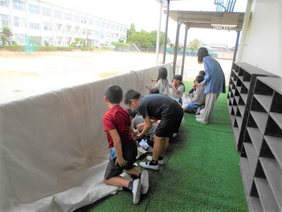 テントの屋根をきれいにしました 令和7年10月15日(水)の朝、4年生の子どもたちが運動会で使ったテントの屋根をきれいに拭いてくれました。 運動会当日は雨が降っていたため、濡れたテントの屋根が砂などで汚れてしまい完全に片付けられないでいたので、とても助かりました。 子どもたちは、仕事を任されたことに喜びを感じながら、テントの拭き掃除や、砂だらけになった廊下の掃き掃除をしていました。