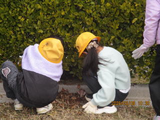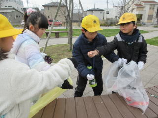 | 3年生は総合的な学習の時間において「すてきなまちにしたいな!」というテーマを掲げ、稲沢市について学習してきました。3学期は「地域のために自分たちができること」を話し合い、西町さくら公園・かなしんでん公園のごみ拾いを計画し、実行しました。児童はポイ捨てされたごみや側溝の落ち葉など、隅々まで一生懸命清掃していました。振り返りには、皆が気持ちよく過ごすために、これからも続けていきたいと記入している児童もいました。 |