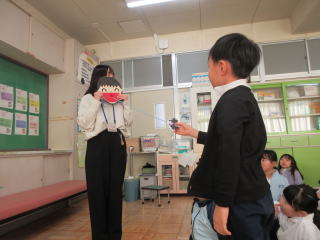 | 学期の始めには、いつも身体測定を行います。「前よりも大きくなっているよ」と声を掛けると、にこっとうれしそうな顔をして、自分の体の成長を喜んでいました。また、養護教諭による保健指導では、「咳エチケット」について話を聞きました。咳をすると台風の勢いで呼気が飛び、くしゃみをすると新幹線のスピードでだ液や鼻水が飛ぶことを模型を使って体感しました。そして、ハンカチや服の袖で口元を覆う方法を知ると、教室に戻ってから早速実践していました。 |