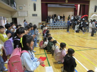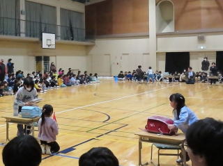 | 6年生を送る会がありました。1年生は卒業式に参加しないので、全員で感謝の気持ちを伝えられるのは、この日しかありません。子どもたちが「最後に6年生と競争したい」と言ったので、ランドセルを使ったリレーを行いました。4月に6年生から最初に教わったのが朝のランドセルの片付け方でした。初めはすごく時間がかかっていたのに今では一人で素早く片付けることができるようになりました。競争は1年生が勝ちました。満足そうな表情を浮かべる1年生と成長した姿をうれしそうに見守る6年生の姿が見られ、和やかで素敵な送る会になりました。 |