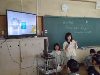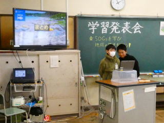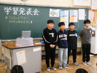 | 総合的な学習の時間に、SDGsについてまとめたことを学習発表会で発表しました。発表資料作成から原稿作りまで一生懸命取り組んできました。また、本番まで発表練習を重ねてきたこともあり、すばらしい発表をすることができました。今回の学習で学んだことを生かして、これからの環境についてしっかりと考えて生活していってほしいと思います。また、今後環境以外のSDGsについても調べ、地球が抱える課題について理解を深めてほしいと思います。 |