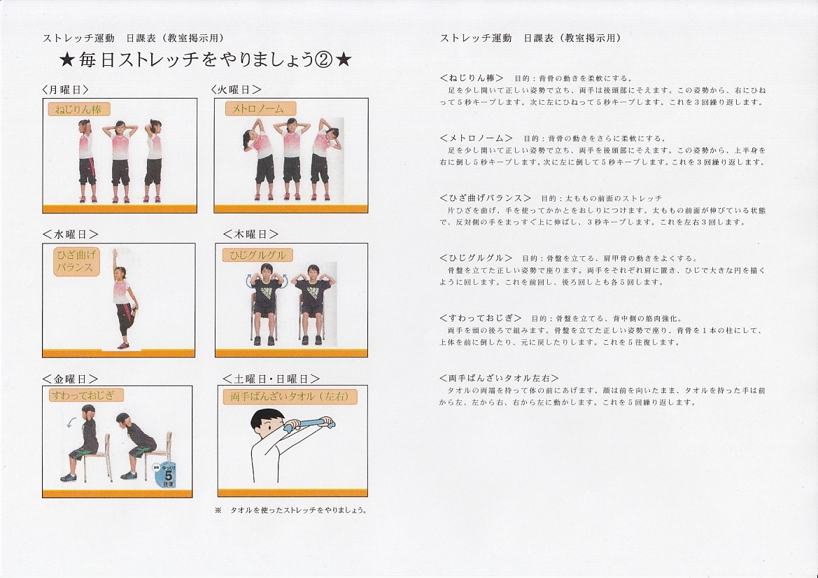 令和元年度から正しい姿勢を習慣化するために、ストレッチや体幹トレーニングに取り組んでいます。正しい姿勢には、「疲れにくい・集中力が長続きする・動きやすい」などの効果があります。ぜひご家庭でも取り組んでみてください。
