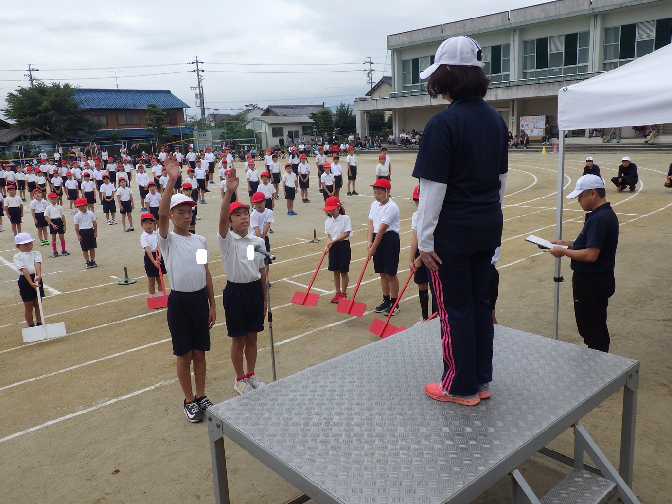 運動会 10/18 10月18日(土)に、運動会が行われました。児童会で決定した「みんなが主役 限界こえよう いしきっ子」のスローガンのもと、児童全員、がんばりました! 「開会式」全校児童で、スローガンを言いました。 1・2年生表現運動「what We Got」みんなに元気を届けました。 3・4年生競争遊戯「綱とり合戦」スピードとチームワークで綱をとりました。 5・6年生表現運動「君に捧げる応援歌」フラッグを華麗に使い、気持ちを一つにして踊りました。 「紅白対抗リレー」代表選手が、見事な走りを見せてくれました。