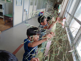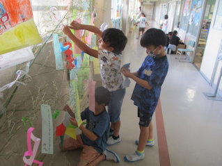 七夕を前に、短冊に願い事を書き、笹に飾りました。将来の夢を書いた子、夏休みにしたいことを書いた子、家族の健康を願った子、様々な願いを見ることができました。願いが叶うといいですね。 |