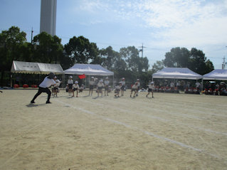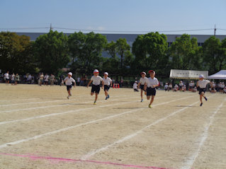 9月30日(土)、最高の天気の下、小正っ子運動会を行いました。「力を合わせて 笑顔の花さく 小正っ子」のスローガンをもとに、競技に臨みました。 最初の種目は徒競走です。50mを力の限り走りぬきました。 |