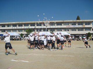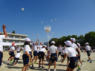 競争遊技は「玉入れ」を行いました。1年1組と2年1組の1組チーム、1年2組と2年2組の2組チーム、1年3組と2年3組の3組チームで競いました。どのチームも力を合わせて玉を入れました。1位は2組チーム。最後は互いのがんばりを讃え合いました。 |