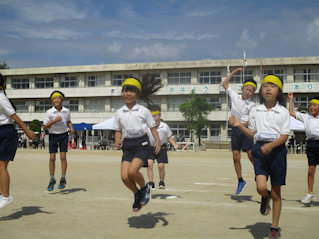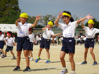 低学年表現は『パプリカ』を元気いっぱい行いました。黄色のバンダナを身に付け、最高の笑顔で踊り、運動場に響き渡る声で歌うことができました。運動会を終え、心に残る想い出をつくることができました。 |