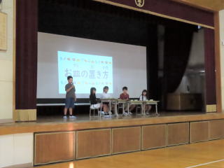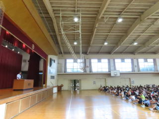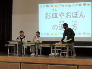 |   児童集会で、給食委員会が実施するキャンペーン企画についての発表を行いました。 給食委員の児童は、給食時のルールやマナーについて、楽しく分かりやすく実演することができました。また、この一週間を強化週間とし、準備から食事、片付けまでをいつも以上に正しくできるように、特に気を付けてほしいことも伝えました。給食がセンター方式になってから約2か月が経ち、子どもたちもずいぶん慣れてきたところです。この機会に、もう一度皆が気持ちよく過ごせる時間になるように、普段の給食の様子を振り返られるといいですね。  |