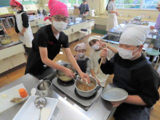 |  5年生の児童が、家庭科の学習でごはんとみそ汁の調理実習を行いました。 自分たちで役割分担をして、責任をもって学習に取り組むことができました。自分たちの手で作ることで、調理の工程だけでなく、食べ物のありがたみを知ることができたようで、いつも以上に残さないように食べようという姿が見られ、すばらしかったです!  |