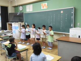 |  1年生の児童が、物語文の音読発表会を行いました。 一人で読むところや、みんなで揃えて読むところを決めるなど、役割分担をしながら練習に取り組んできました。みんなの前での発表となると緊張した面持ちも見られましたが、「声の大きさや強さ」「役になりきって」「聞き取りやすく」などの目標を意識しながら、上手に音読をすることができました。  |