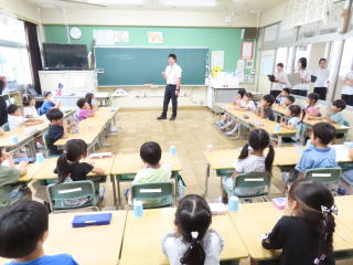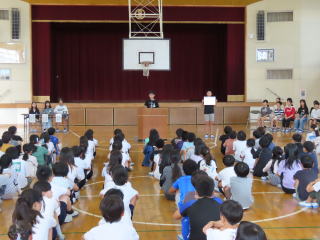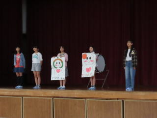 |  児童集会を行いました。児童会役員が全校児童から公募していたオリジナルキャラクターの名前の発表をしたり、運動会の目標宣言の練習を行ったりするなど、自分たちの学校は自分たちで盛り上げていこうとする姿が見られ、嬉しく思います。 新しいキャラクターは、これから学校生活の様々な場面で登場し、子どもたちとともに活躍してくれることと思います。どんな名前になったのか、ぜひご家庭でも話題にしてみてください。  |