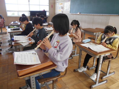 R6.2.6火【4年:3限 音楽】リコーダー 楽器練習です。タンギングをしっかりとしながら、リズムをとってしっかりと指押さえをしてきれいな音が出るように練習しました。練習を重ねるたびに、きれいなメロディを奏でられるといいですね。みんなで音を合わせて練習できる光景がとてもありがたいです。 |