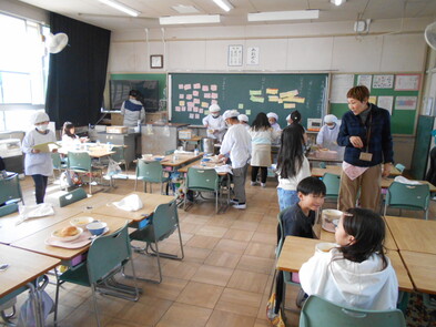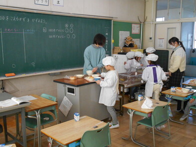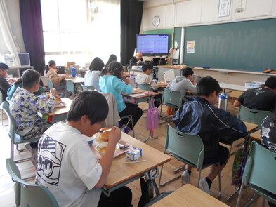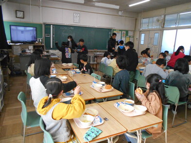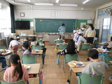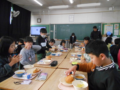 R6.2.6火【4年給食】 このところ、感染症でお休みの子が全校的に増えています。今日は、2年生のみ欠席ゼロで、他学年は何かしらの理由でお休みの人がいます。 2年生以外は、給食を前向きで食べました。 |