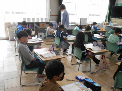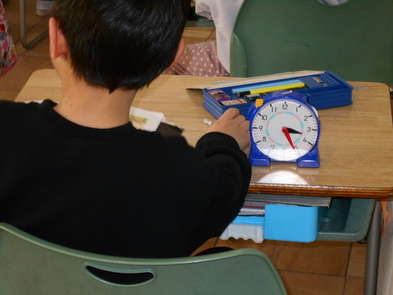 R6.2.13火【1年:4限 算数】なんじなんぷん 時計、時刻の学習が始まりました。長い針、短い針の見方に慣れるといいですね。 |