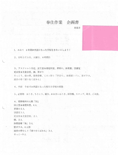 R6.2.15木【6年 企画書】 6年生が卒業を控えて、企画書を作成し(情報活用能力の成長の一端が見られうれしいです)、奉仕作業をしてくれるようです。企画書もつくってくれたので、いつ、どんなことをやるか分かります。 めあては、「6年間お世話になった学校をきれいにしよう!」とあります。とても有り難いです。 |