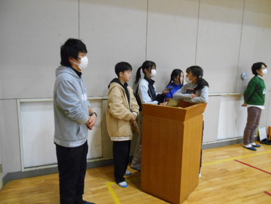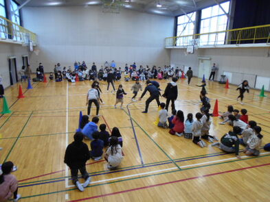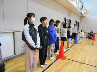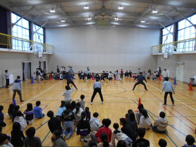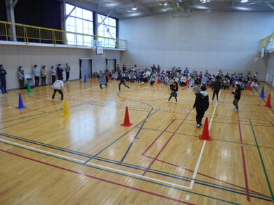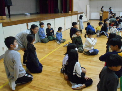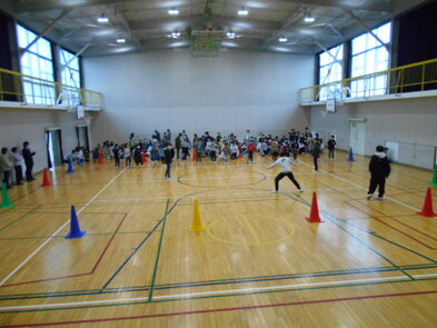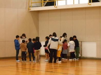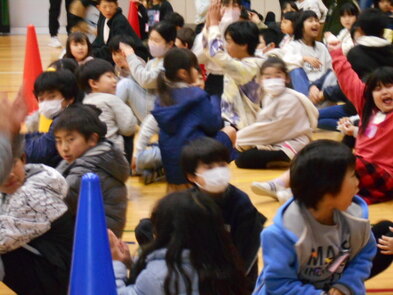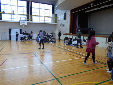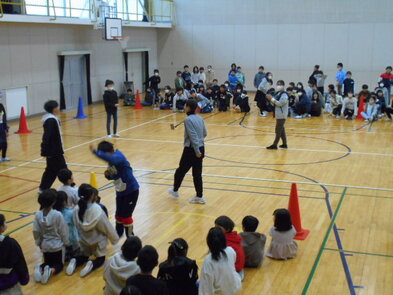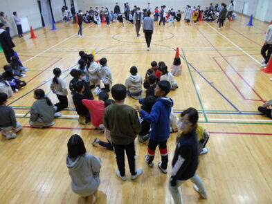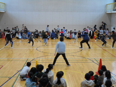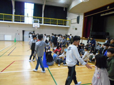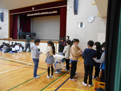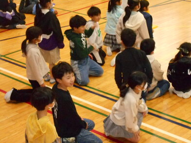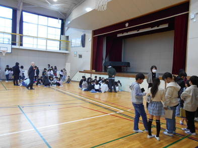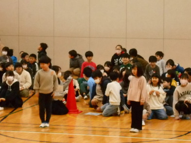 R6.2.15木【朝8時20分~】 職員室にも校舎にもあまり人がいないなと思ったら、多くの児童が体育館に集合していました。5年生が中心になって、何やらやり始めるようです。 |