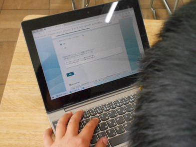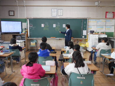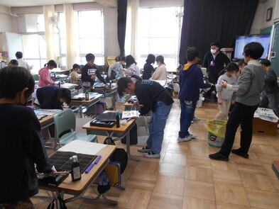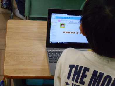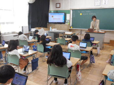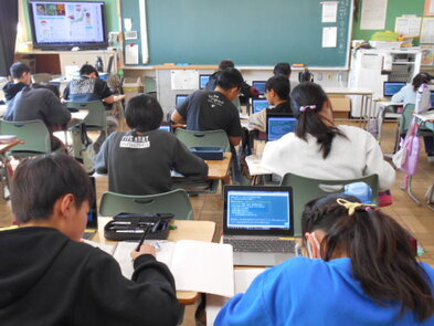 R6.2.16金【5年:5限 体育】サッカー 運動場や体育館ではなく、教室で体育を行っていました。タブレットPCに何を打っているのか見てみると、サッカーレポートを作成していました。チームでの話し合いの結果について、各自がformsで考えを書き込み、グループで共有するようです。 |