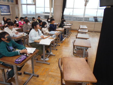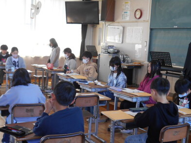 R6.2.21水【3年:6限 音楽】シとドの音をふこう 「思い出のアルバム」という曲の練習に入ります。誰もが聞いたことのある曲ですが、まずは口ずさんで曲を覚えることにしました。この後、リコーダーで吹けるように練習します。 |