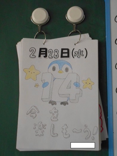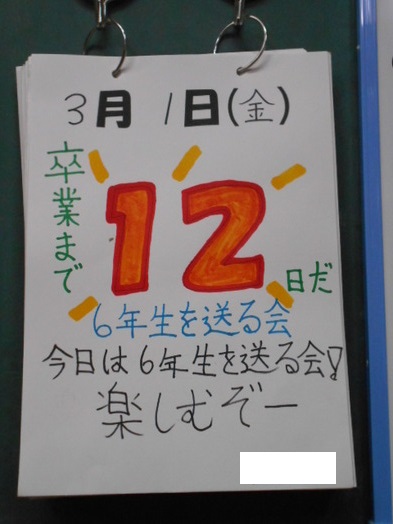 R6.2.29木【6年教室の掲示より】 下校後、すでに明日のカレンダーがかかっていました。明日は、6年生を送る会です。下級生の思いがいっぱい詰まった会になりそうです。 |