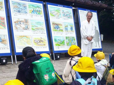 愛知県指定無形民俗文化財「祖父江の虫送り」の実行委員の方々をお招きして、地域の伝統文化について学びました。 |