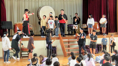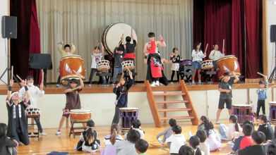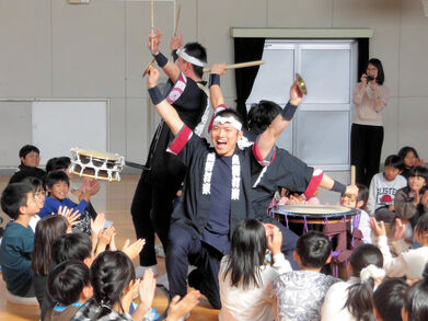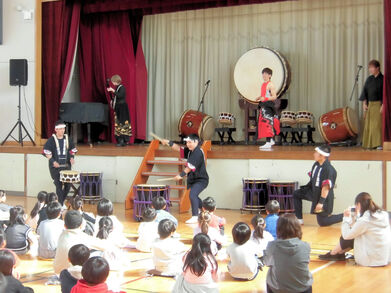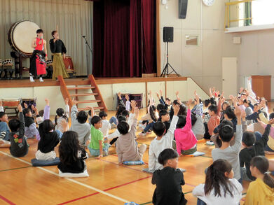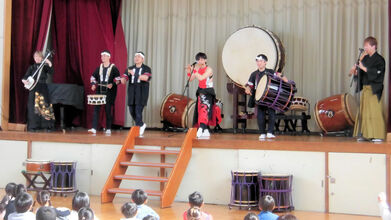 和太鼓集団「熱響打楽」による演奏を聴きました。本格派和太鼓を軸に篠笛、津軽三味線、尺八や舞踊・演劇の要素を取り入れた独自の劇的な舞台でした。子どもたちは、大迫力の演奏に目を輝かせて聴き入っていました。 |