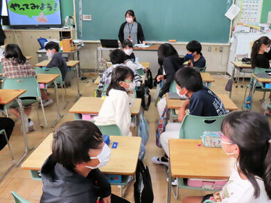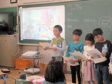 学活でしょうか、にぎやかな、そして楽しい声が廊下に響いていました。タブレットPCを使ったクイズを出しているようです。自分が関心をもっていることを交流するのはいいですね。 |