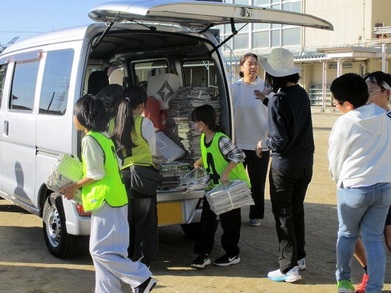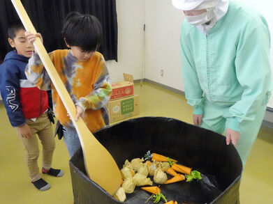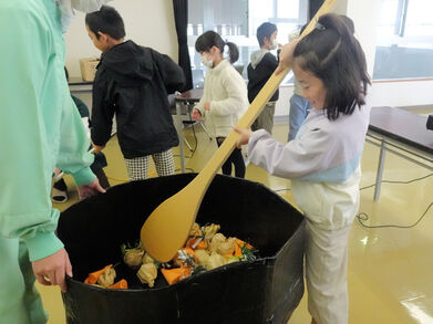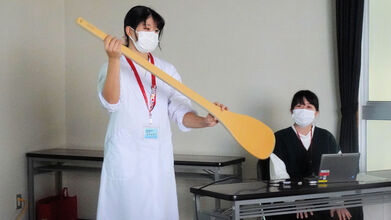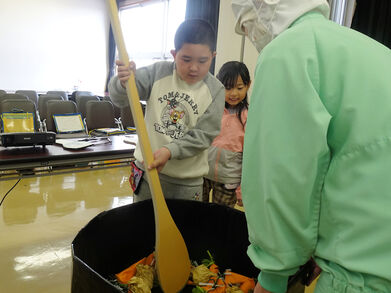 2年生が祖父江町給食センターに行き、どのように給食が作られているのかを学びました。普段、調理員さんが使っている大型スパテラ(しゃもじ)を見せてもらい、模型を使って調理作業を疑似体験しました。給食を作っている人たちの思いや願いを知り、感謝の気持ちをもちました。 |