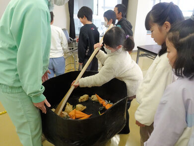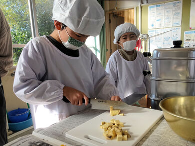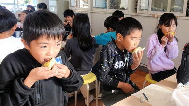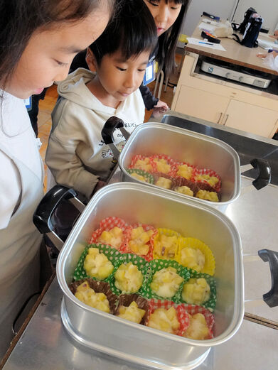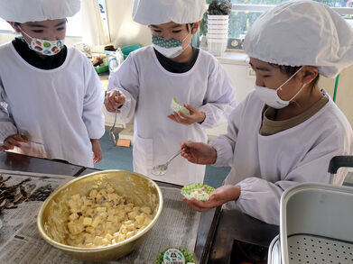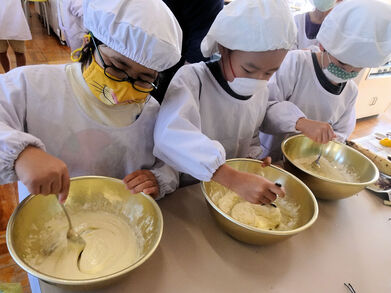 2年生が生活科の時間に収穫したサツマイモを、おにまんじゅうに調理しました。おいしく味わいながら収穫の喜びをかみしめました。 |