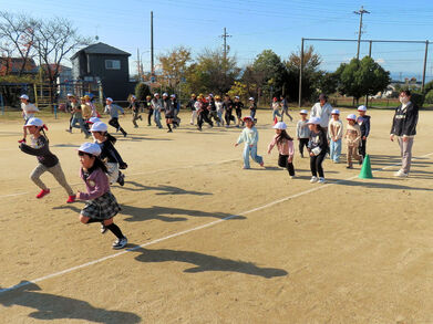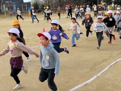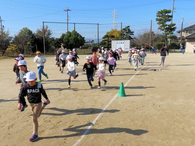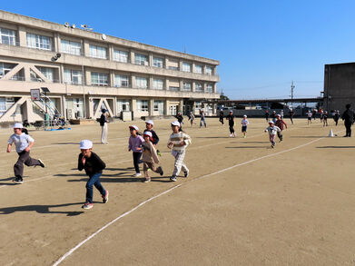 元気いっぱいの牧川っ子たちが、頑張って持久走練習に取り組んでいます。 |
