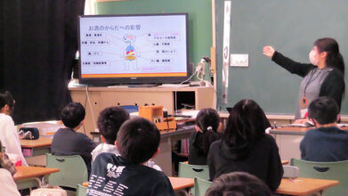 1・2年生が、「早寝・早起きは、なぜ大切なのだろうか」「なぜ、朝ごはんを食べた方がよいのだろうか」「元気が出る朝ごはんとはどのようなものなのだろうか」といった内容を学びました。 |