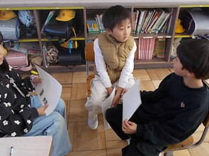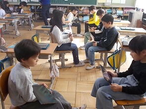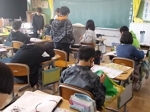 1年生と3年生は、昨日の校外学習の振り返りをしていました。