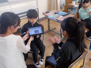 タブレットPCに撮っていた写真を互いに見せて、大型モニターで級友の大事なものを確認しました。「漢字ドリル」「バスケットボール」「スイッチ」など幅のある意見が多く見られました。物を大切に扱うことのよさに気づき、身の回りの物を大切にして生活することについて、級友の見方を通して、多面的に考えることができました。