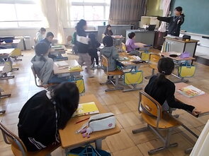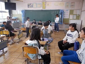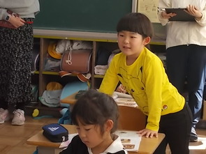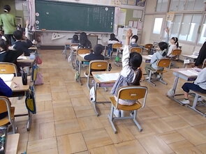 2年生教室では、机の上に算数の教科書を縦に置いて、ノートは開かず、姿勢を正して担任の先生の話を聞いていました。担任の先生からは、「学級委員に〇〇さんがなりました。」と紹介がありました。すると、拍手が起こり、「がんばってねぇー」と声がかけられました。素敵な関係性が育まれていました。