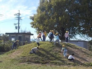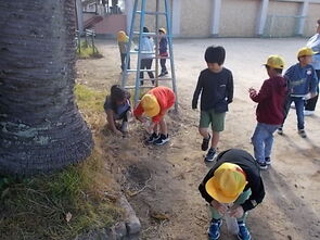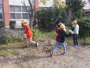 落ちている実を拾って、空のペットボトルに入れてマラカスをつくる準備をしました。カラカラと音を立てながら、実を集めるのが楽しそうでした。秋を感じながら、楽器をつくる楽しい活動です。
