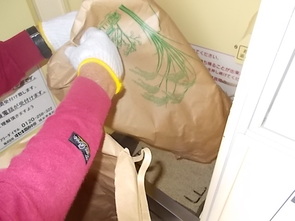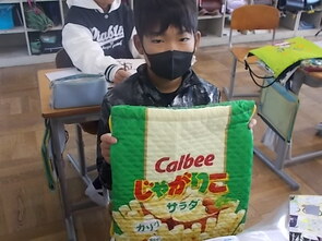 ナップサックをつくりました。さまざまなデザインの布を使って作り上げたようです。自分で作った道具には、愛着がわきますね。大切に使ってください。
