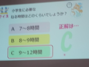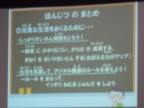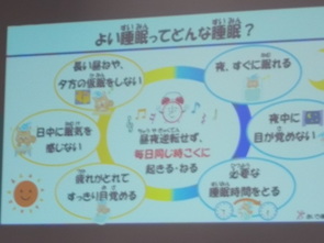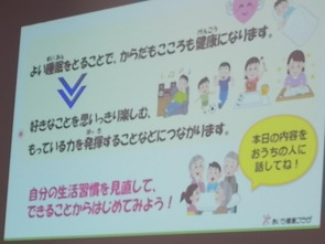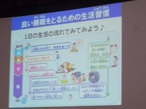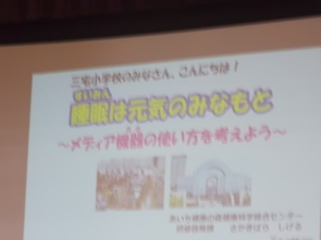 睡眠の大切さ、メディアとの向き合い方について講演をしていただきました。よりよい生き方、充実した人生を健康に過ごすための学習をしました。首を曲げてスマートフォンを見続けるのは、25kgの負担を首にかけていることと同じことであったり、自分を守るために、まずは自分とメディアの関係を理解し「時間」「場所」などのルールを考え取り組みましょうといったお話もありました。