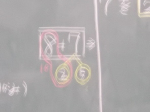「8+7」の考え方について復習しました。8に対して、7を2と5に分解して考え、8と2で10、残りの5を足して15を導く考え方です。